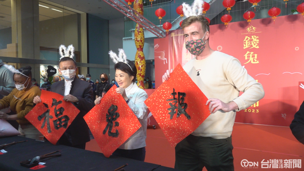 市長與眾人共同揮毫,一同寫下「春來福兔報平安」 等祝賀佳句,為了迎接農曆春節的到來,台中市政府特別舉辦迎新揮毫贈春聯活動,吸引許多民眾一早排隊免費索取賀聯,讓現場充滿濃厚的年節氣氛 。