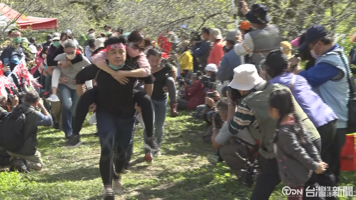 ▲踏雪尋梅趣味競賽的重頭戲就是夫妻揹負賽跑,獎品豐富吸引不少夫妻前來挑戰/記者金芸亘攝