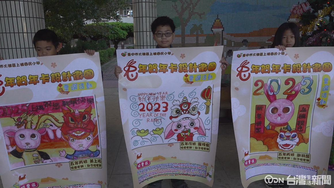 結合兔年意象,畫出可愛的兔子穿上代表上楓國小的校服,更融入學校的舞獅,採用暖色系繪製,這三幅作品都不僅展現充滿喜氣的特色,也融入學校的特色,經過全校票選後,最後由五年級羅梓宸同學獲得最高票,他的賀卡設計將成為學校寄送的新年祝福。