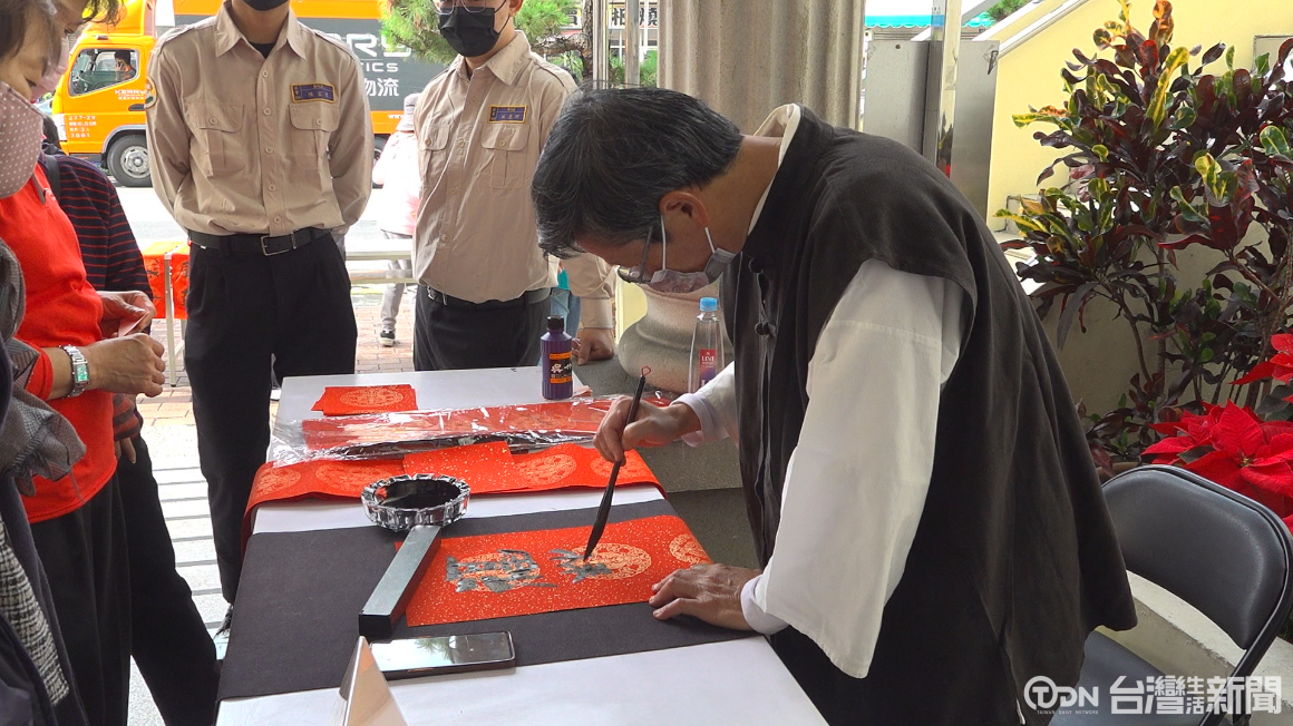 民眾圍繞在桌前排隊,等著書法大師揮毫,開心拿著春聯到一旁晾乾。農曆過年家家戶戶都會除舊佈新,張貼春聯喜氣洋洋迎新春,東勢區公所這天在公所前廣場舉辦新春揮毫活動。