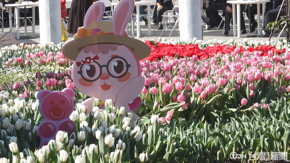 ▲這一次將鬱金香結合兔年主題,仿照三隻小豬的童話故事,打造小兔三兄妹/記者 陳昭安攝