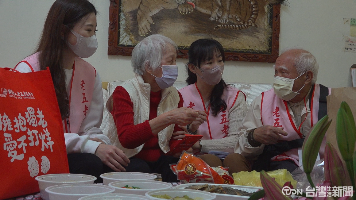 為了讓長輩能夠吃到現煮的熱騰騰年菜,老五老基金會這天號召志工,一大清早四、五點開始打菜包裝,再由志工一同協力送到獨居長輩家中。除了年菜之外,還有豐富的乾糧物資、國小學生繪製的紅包袋等等,大家也跟長輩閒話家常,祝福長輩新春快樂,氣氛相當溫馨。