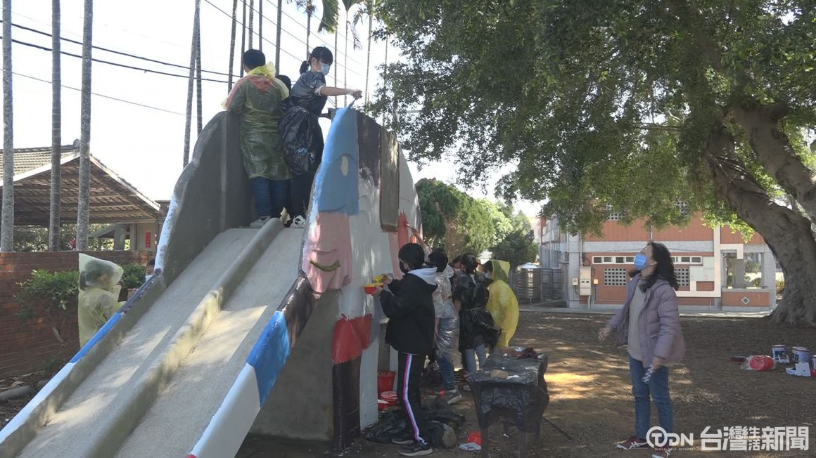 ▲藉由彩繪大象溜滑梯讓學生從生活當中來培養著美感/記者李偉廷攝