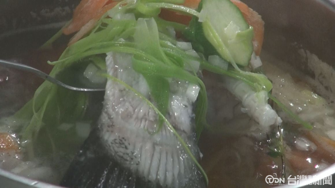 ▲將剩餘的魚骨頭,連同切好的蔬菜皮全都倒入鍋中,熬煮成基底高湯/記者 陳柏翰攝