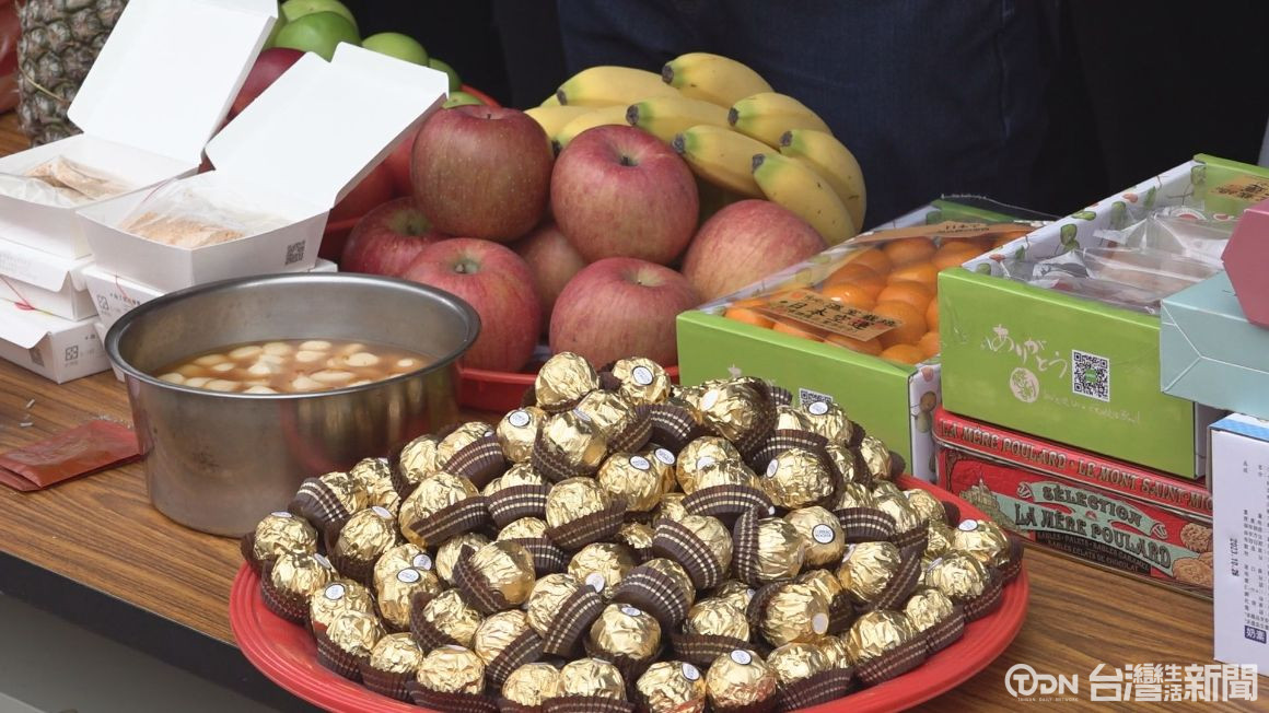選在充滿甜蜜的,2月14日西洋情人節開工,供品也精心搭配,除了素果外,放上整盤的巧克力,還有麻糬配花生粉,象徵好事會發生,服務處內邀請中華茶藝聯合促進會為民奉茶。