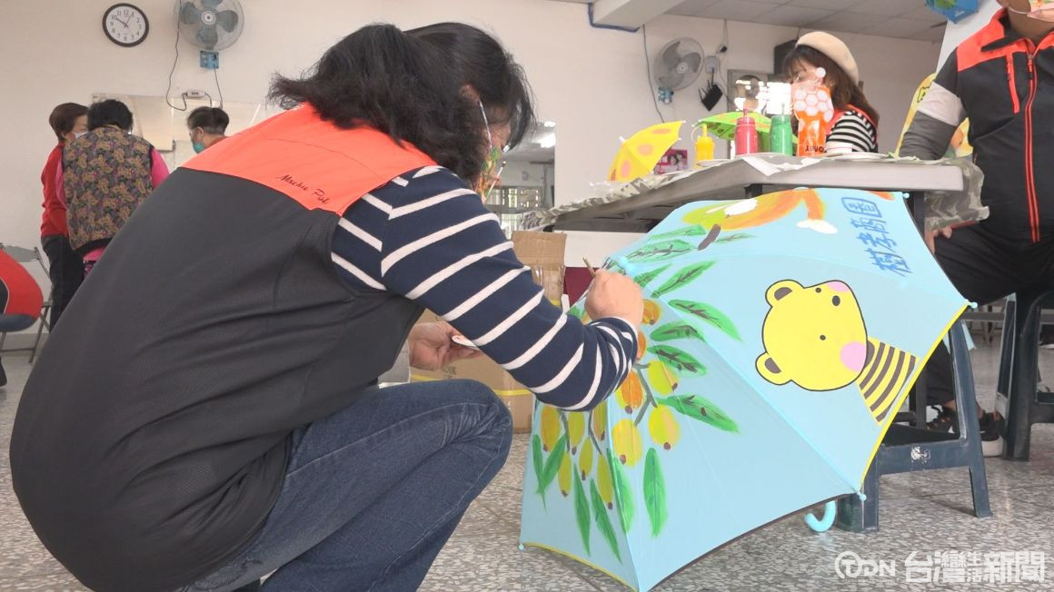 ▲長輩們發揮創意畫上枇杷黃花,讓傘面相當豐富/記者 莊詩亭 陳昭安攝