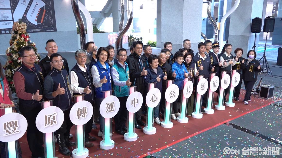 台中市交通局表示,豐原轉運中心去年9月啟用,有29條公車路線進駐。為了讓空間藝術化,邀請在地藝術家打造裝置藝術,圓盤由地面延伸而出,融入山城地景特色,3條區域支線,用不同顏色對應,像是地圖縮影。
