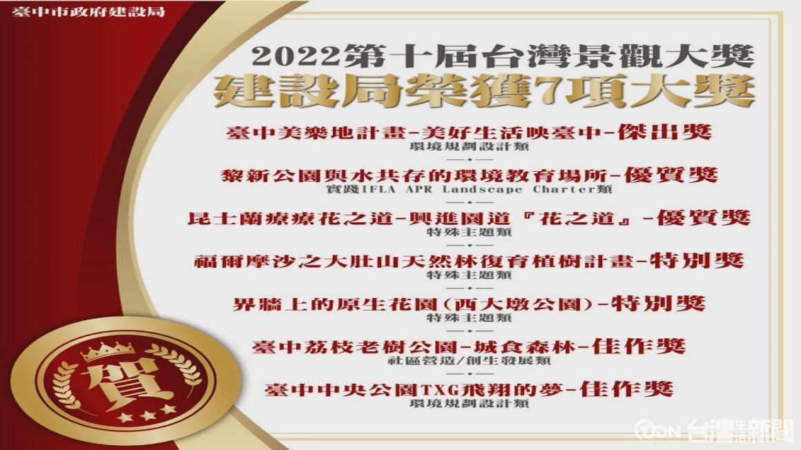 台中市建設局表示,全國參賽件數上百件,這次在特殊主題、環境規劃設計和社區營造上都有不錯的成績,像「黎新公園與水共存的環境教育場所」榮獲實踐優質獎、「台中荔枝老樹公園-城食森林」榮獲社區營造/創生發展類佳作獎等等。