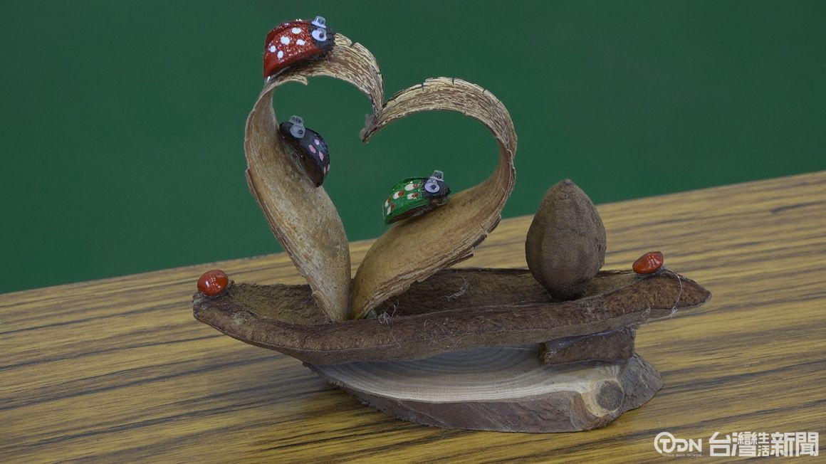 同學拿起畫筆,將種子彩繪成甲蟲,有的人則是把種子、樹枝等,組裝黏貼成相框、筆筒等裝飾小物,每一件都獨具特色且充滿童趣,這些手工藝品全都是大秀國小學童的心血結晶。