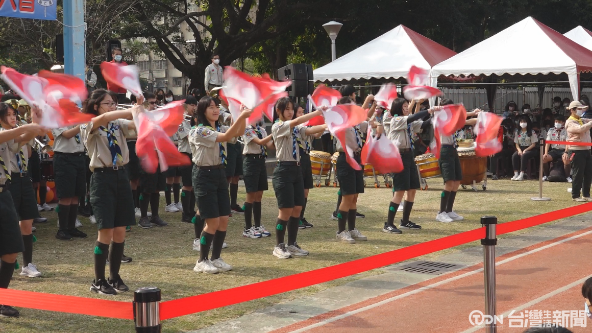 大道國中學生朝氣蓬勃的旗舞表演,讓人振奮精神,接著還有童軍團帶動唱跳,現場活力四射,慶祝3月5日童軍節,台中市政府在光復國小,舉行全市童軍節慶祝大會,國高中約有1500多名童軍參加。