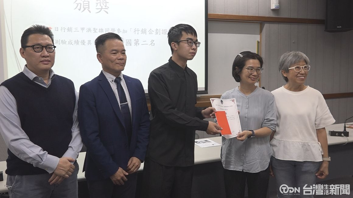 能在全國近1500人的競爭中,奪得行銷企劃認證第2名佳績,實在是不簡單,台灣行銷科學學會,專程到南開科技大學,為學生洪聖雄頒發獎狀和獎金。