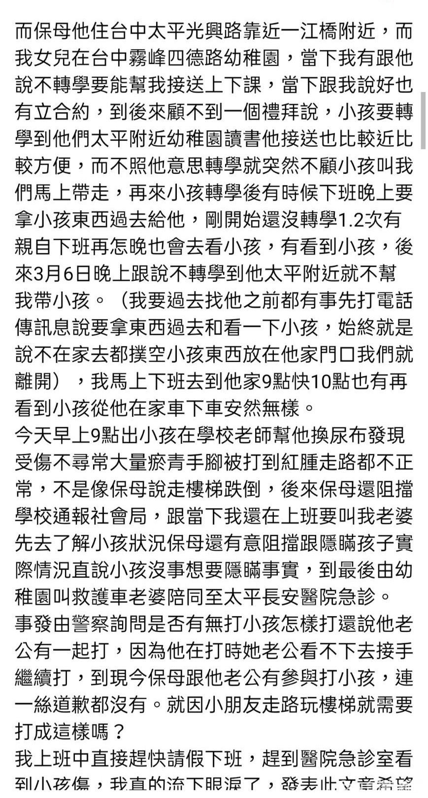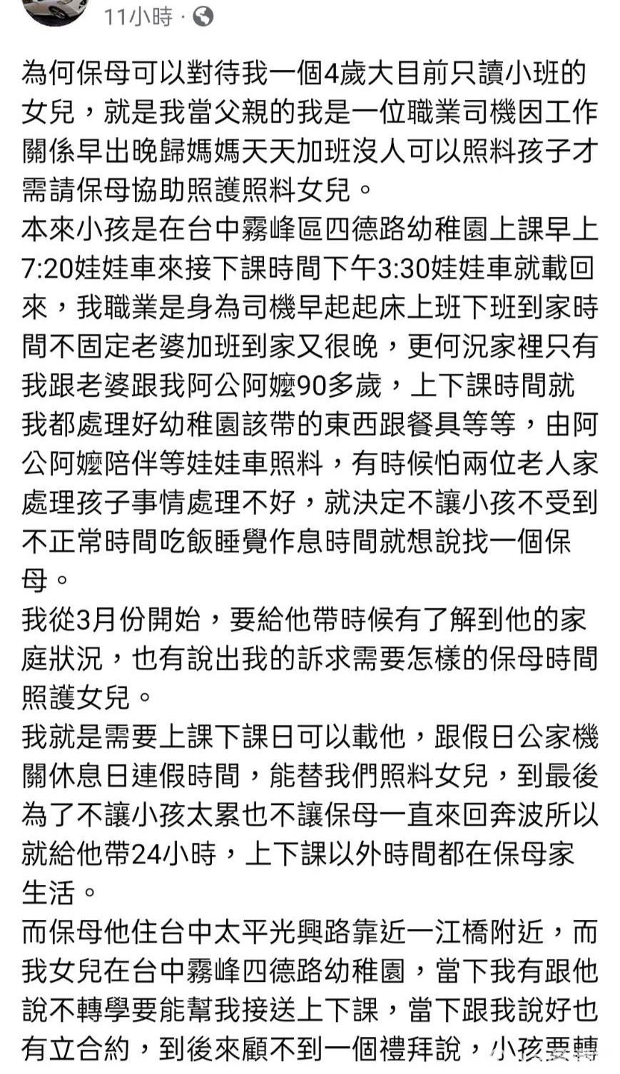 ▲女童父親發文闡述與保母接洽經過/取自女童父親臉書