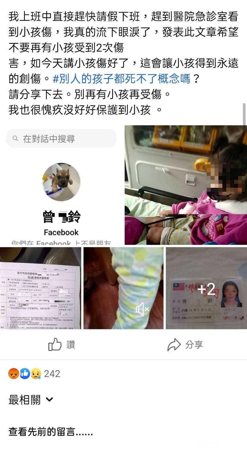 台中太平一起虐童案引發關注,一名父親在臉書發文表示,自己4歲的女兒無故遭受施虐,因工作關係不得不請保母照料女兒,怎料卻發生如此令人心痛之事!女童遭保母以橫條鞭打,身上多處挫傷、瘀青,手腳被打至紅腫,還聲稱傷口為女童自行跌倒所致,行徑十分可惡。