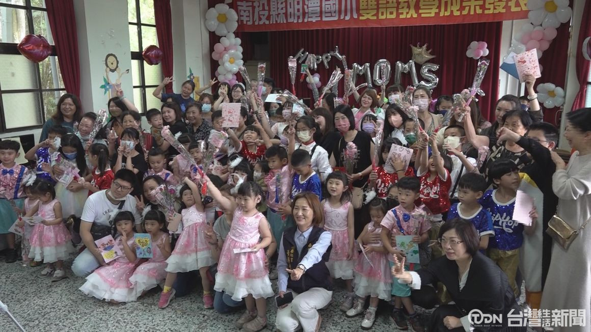 明潭國小推廣沉浸式英語教育,將英語融入生活跟藝術,提高學生的英語能力,為了呈現平時學習成果,學校舉辦一場成果發表會,內容包括英語脫口秀、英語話劇表演,還有歌舞才藝,並且配合一年一度的母親節,安排學生奉茶,祝福與會的師長母親節快樂。