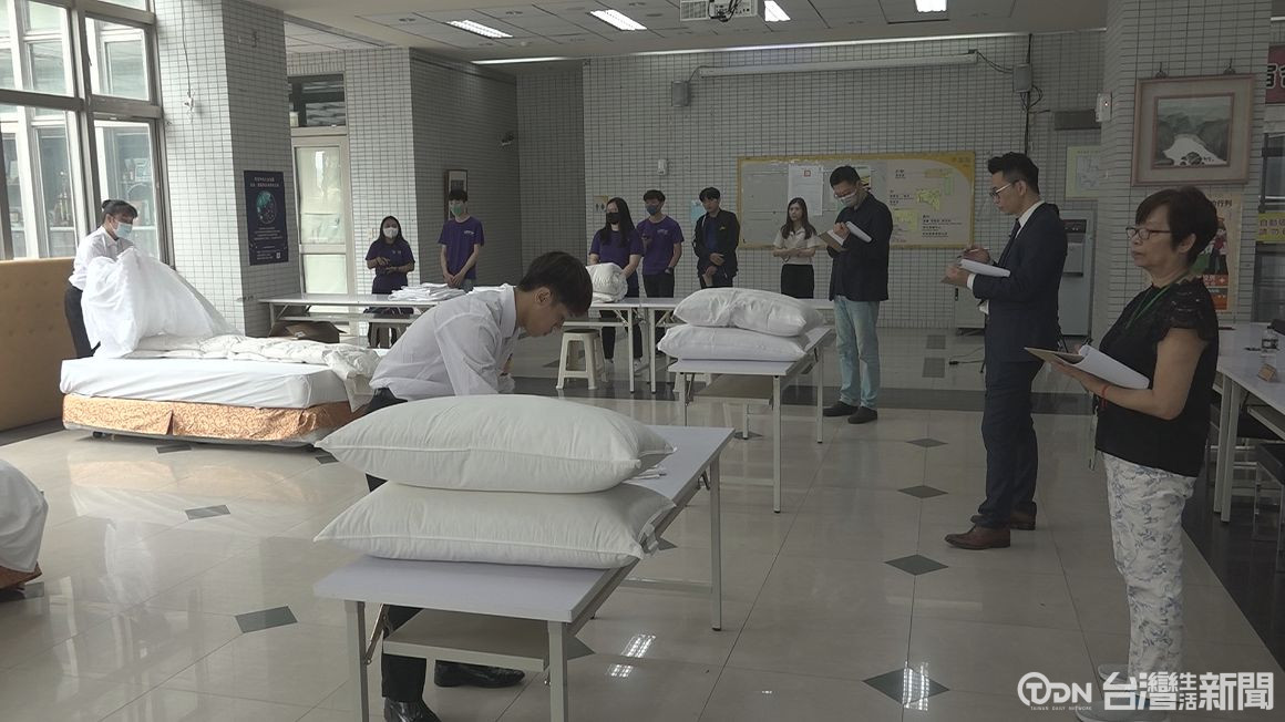 經過示範觀摩後,選手正式展開競賽,分成兩個場地,進行托盤和房務整理服務,除了注重服裝儀容,也比速度比專業。