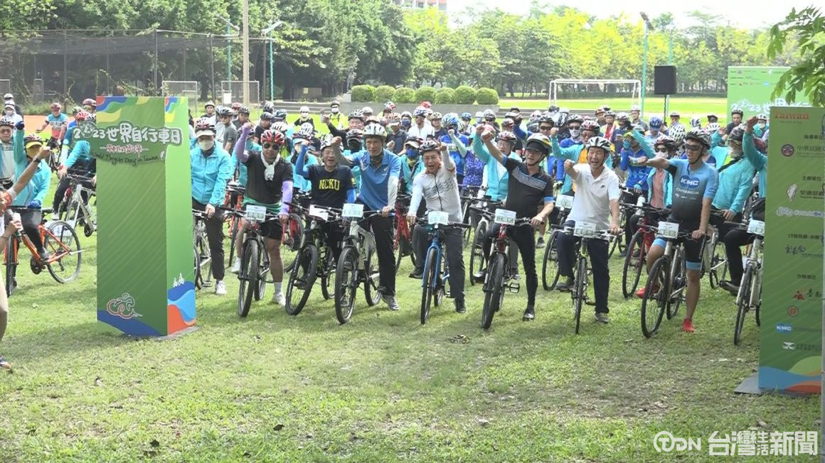 今日在臺南遠東科技大學運動場,一早上來了眾多愛好騎自行車民眾,參加2023世界自行車日,現場有市府觀光旅遊局、中華郵政、雲嘉南國家風景區管理處、南區養護工程分局與民間企業等人,將從遠東科技大學出發到沙崙高鐵站,藉由騎自行車來響應低碳做環保,兼顧運動健身來完成第19號路線。
