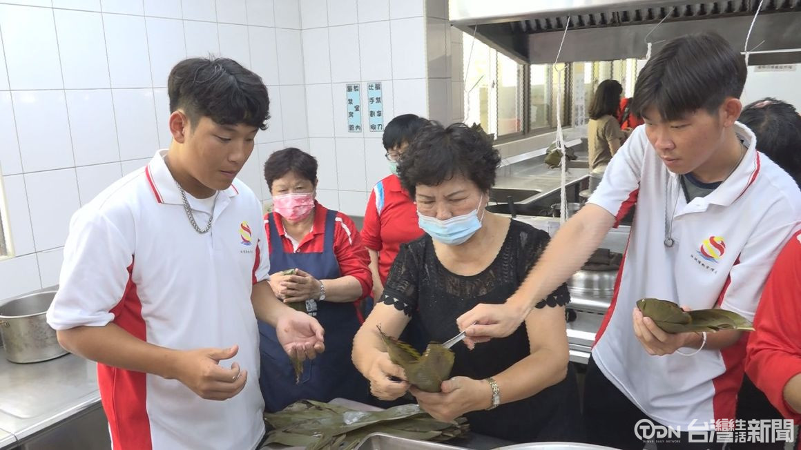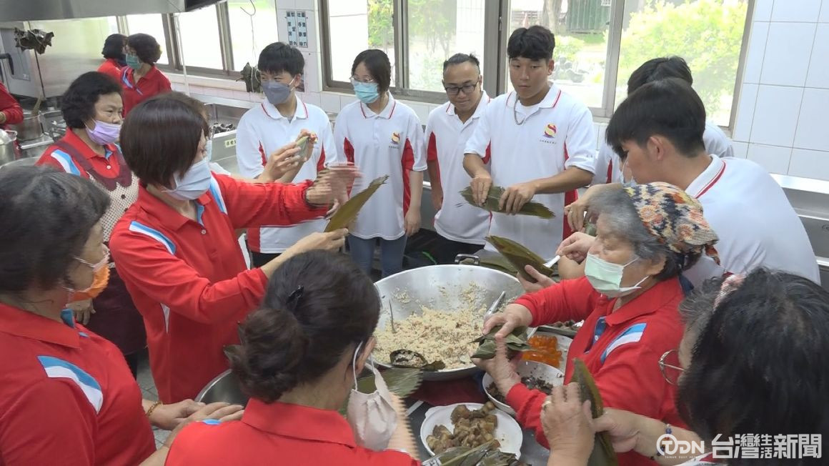 今日在臺南新市遠東科技大學烹飪教室內,能看到一群樂齡長輩與學生在忙著包粽,並由長輩帶著學生一邊解說如何用粽葉,然後如何放料,才能完成綁好一粒粽子,好像阿嬤將一身好手藝,傳授給自己孫子學習一樣,畫面令人溫馨又感動。
