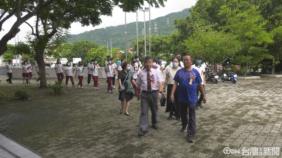 ▲國姓國中第65屆暨第八屆補校畢業典禮,在校長、老師率領下,畢業生一一進入會場/記者 范宏坤 攝