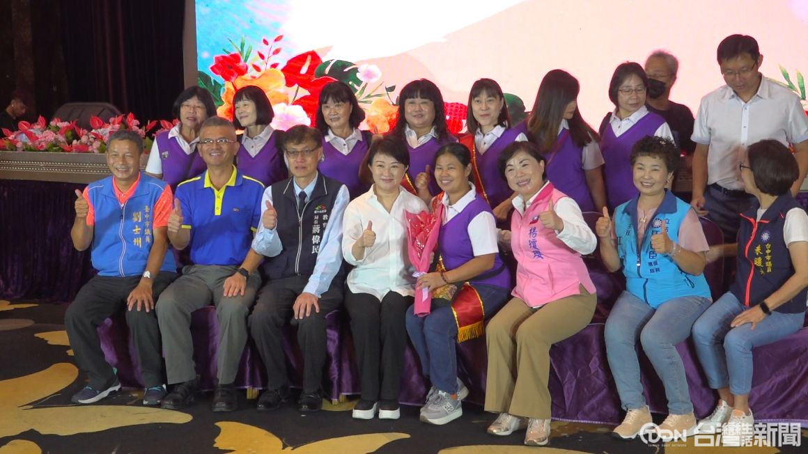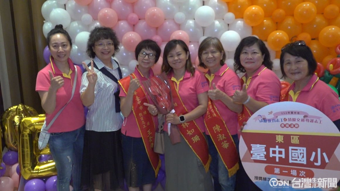 獲獎志工從台中市長盧秀燕手中接過火鶴花,象徵著市府對於他們的感謝,台中市績優教育志工暨績優交通導護志工表揚,這天登場,有千名的志工獲得表揚,各校也都到場同慶,場面熱鬧。