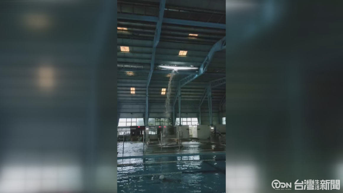 ▲歸仁的游泳池出現屋頂破洞,導致大雨變成瀑布沖進池中,引起民眾熱議。