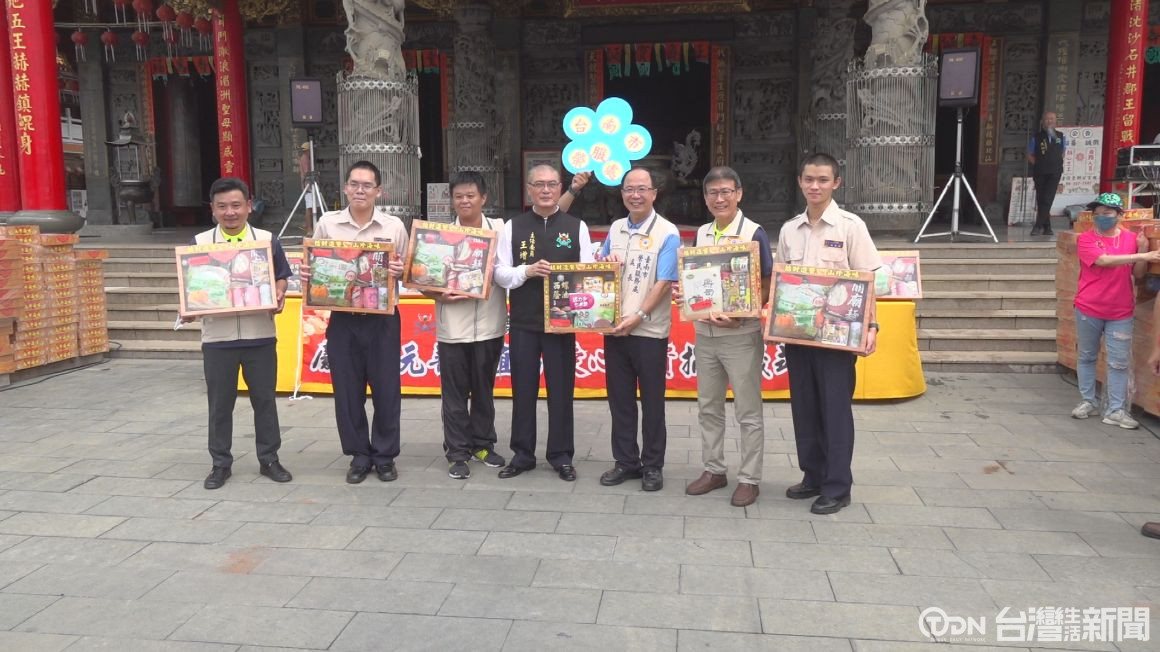 ▲農曆7月15日中元節,正統鹿耳門聖母廟廟方特別開放民眾佈施植福,今年總共認捐3千多盒的普渡品,要來捐贈給土城7個里跟43個單位/記者 蘇英豪攝。