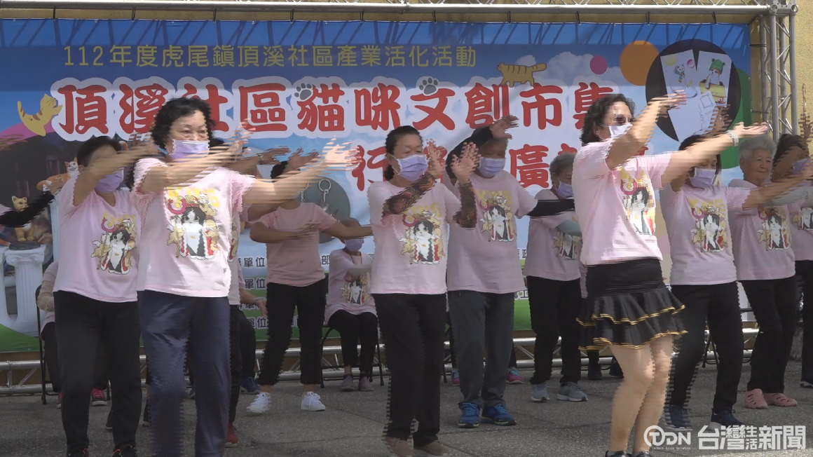 長輩隨著音樂聲,來展現學習的舞蹈。這是112年度農村再生頂溪社區文創市集推廣計畫,邀請虎尾七個社區來參加,當中不只有特色料理,也有手作作品跟社區表演,讓來參加的長輩都非常開心,也讓社區能互相交流。