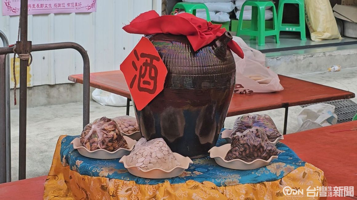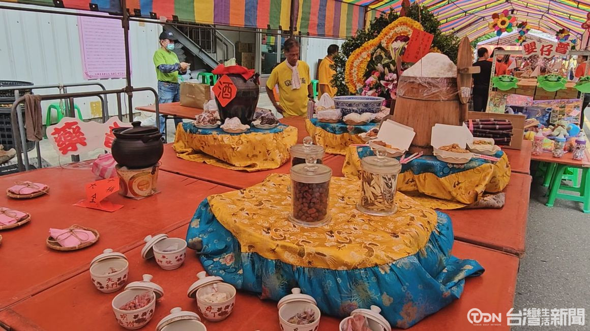 ▲北興里的普渡區,今年設有藥普準備了中藥材、十全大補湯、藥酒讓好兄弟能補身體、治病使用/記者 蕭建緯攝