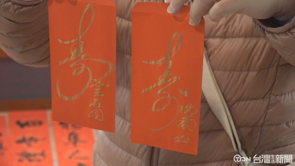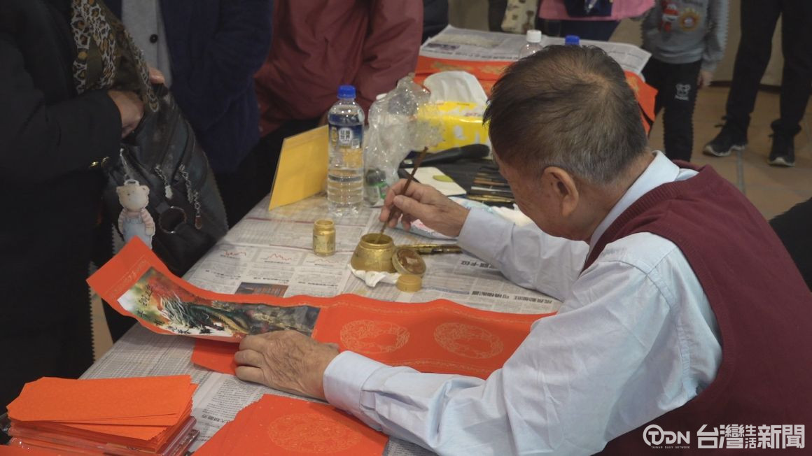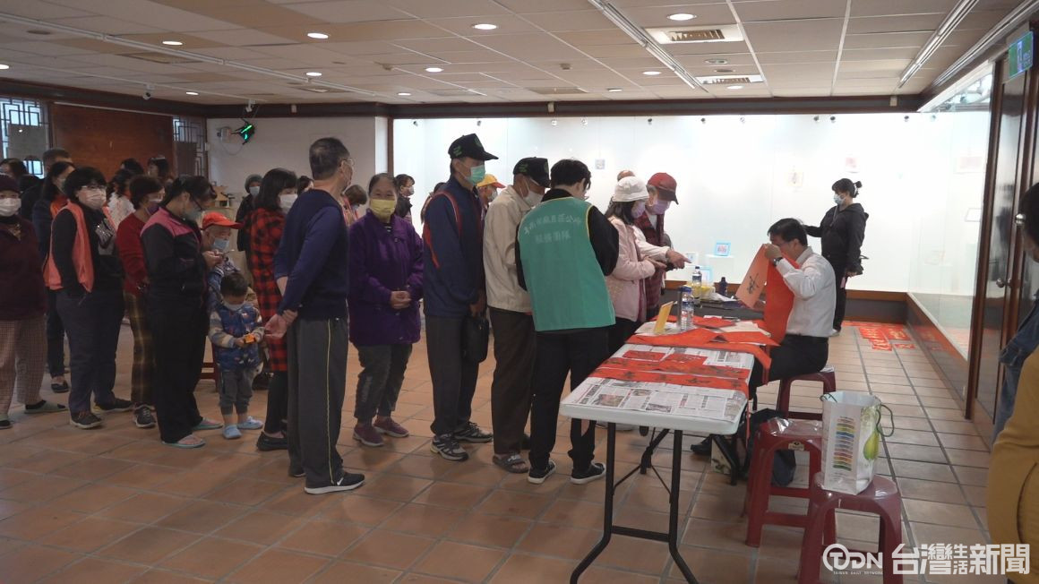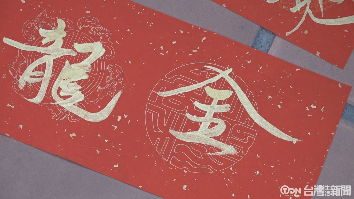 書法老師一張接著一張寫,除了有貼在門口的春聯,也有菱形單一字的春聯,這是麻豆區公所為了迎接金龍年,所準備的新春活動,現場可以看到有許多民眾排隊要領春聯。