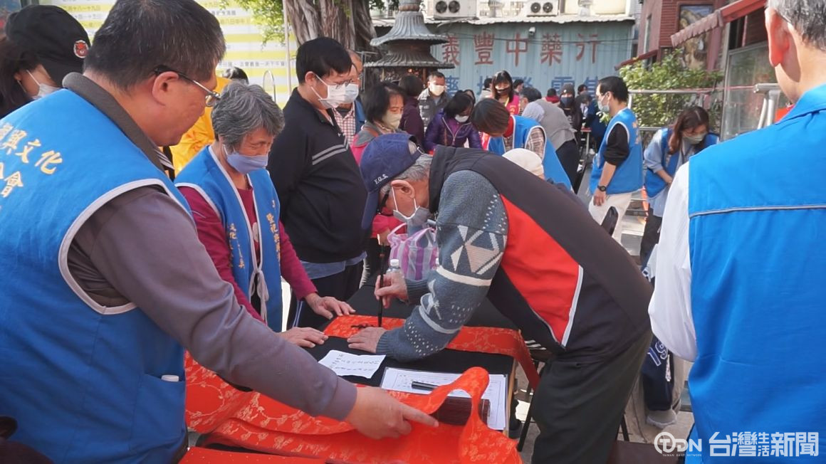 ▲大觀音亭暨祀典興濟宮舉辦「大師揮毫贈春聯」活動邁入第四年今年更邀請退休校長翁資雄洪麗里莊崑謨和鍾肇明等四位大師現場書寫索取民眾相當踴躍祝願民眾家中墨香飄揚迎接祥龍獻瑞新年好運來/記者 陳嘉升攝