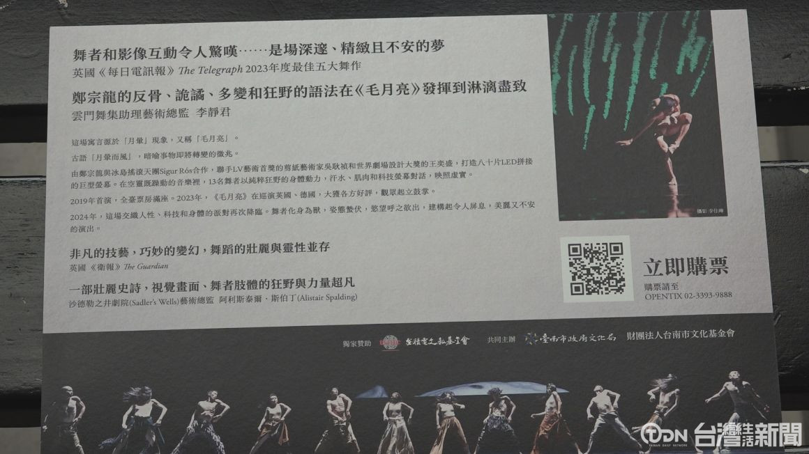 臺南市立文化中心表示,「毛月亮」的作品運用許多巨幅LED螢幕,透過舞者全身的汗水、肌肉和力量去與科技、數位媒介來對話,邀情臺南民眾前來觀賞。