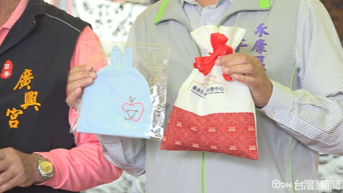 ▲永康區公所 贈送手繡蘋安嬰兒帽,跟台南400祈願福袋,希望每位新生兒能平平安安長大/記者 蕭建緯攝