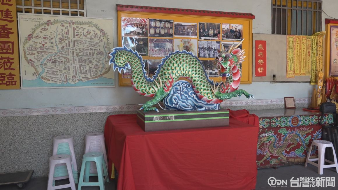 ▲臺南市北區開基玉皇宮九龍系列第一隻的「神龍迎春」目前在廟內展示玉皇宮接續將委製臺南市傳統糊紙工藝師 吳文進製作九隻糊紙神龍為民眾龍好利來保平安/記者 陳嘉升攝