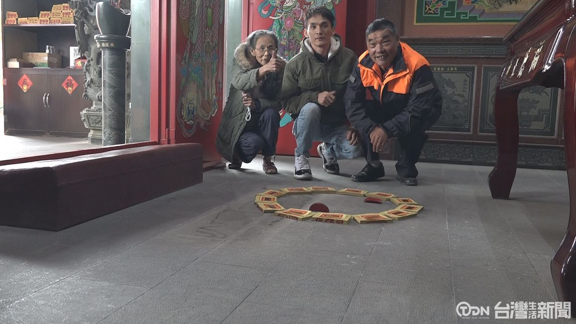 ▲陳姓信眾因當日無法前往口店福德爺廟為土地公祝壽,因此在昨(8)日下午6點左右,先行前往並擲筊詢問土地公需要什麼供品,沒想到竟擲出立杯。記者 謝沂辰/攝