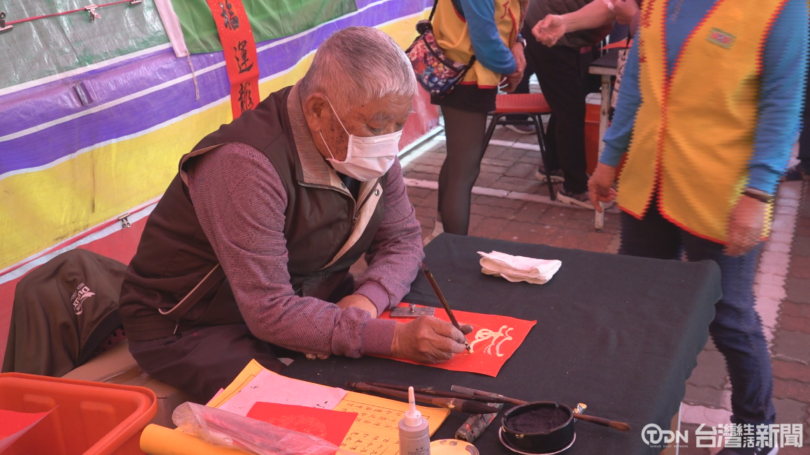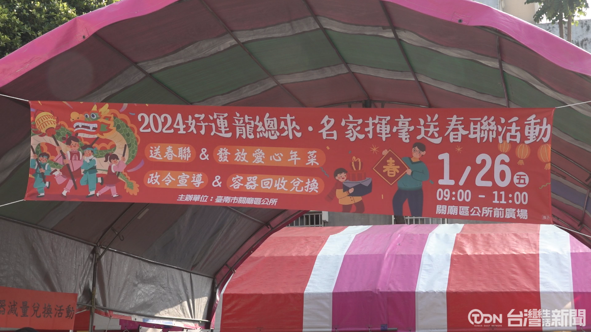 書法老師一筆一筆揮毫,寫下龍年的春聯,這是關廟區公所每一年都會舉辦的送春聯活動,今年邁入第十年,現場也安排篩檢和政策宣導等豐富的活動,吸引很多民眾參與。