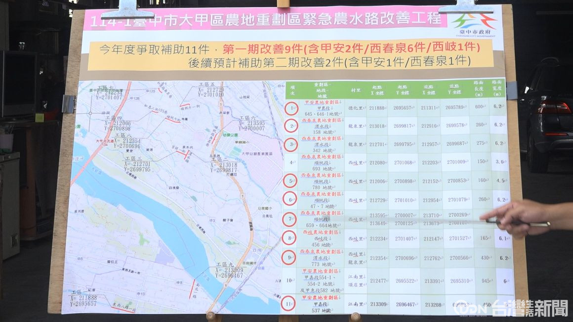 為解決農路問題,民代這天也特別邀集相關單位前來會勘,並順利爭取到近千萬元經費,將優先針對大甲區九處農路,進行路面刨鋪與排水設計改善等,範圍涵蓋頂店里、德化里以及西岐里等,預計最快年底前就能完工。