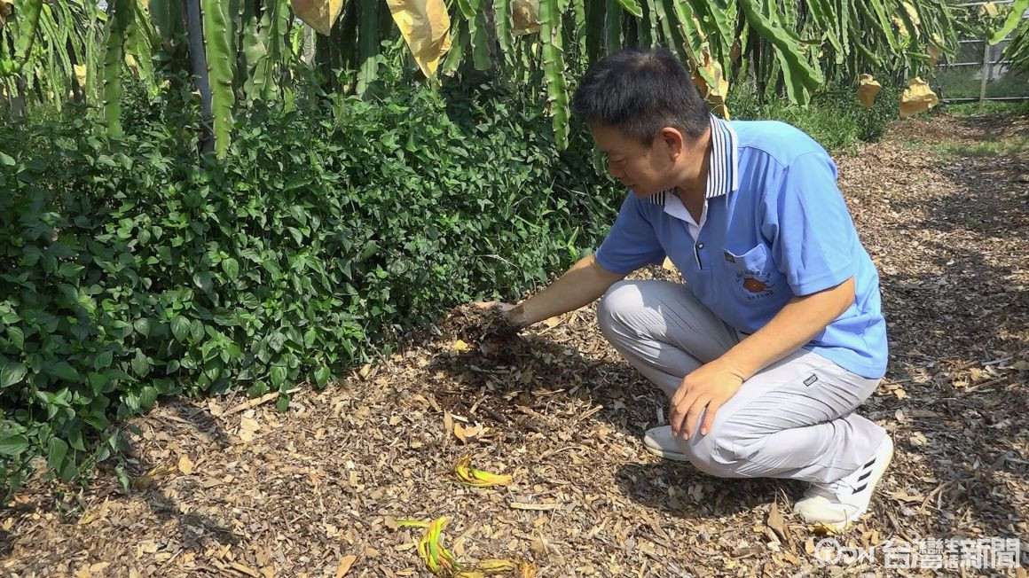 仔細巡視果園狀況,外埔區農友劉興陽,平時是一位上班族,只有在假日及空閒時間才會下田,雖然投入時間有限,但他自創了一套「鋪木屑」的創新田間管理法,改善土壤保濕與透氣性,並搭配微生物菌與有機肥等,讓每一顆紅龍果都長的又大又甜。