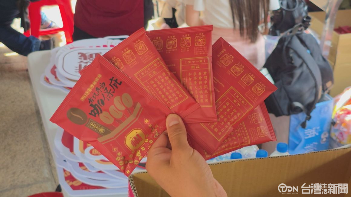 ▲本次咖啡包裝也有以北港朝天宮籤詩來設計,希望將北港媽祖的祝福送到民眾手頭,也抽出屬於自己的獨特祝福咖啡包。/記者 陳佳昇 攝。
