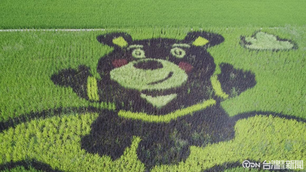 ▲圖為草屯鎮北投國小推動彩繪稻田10多年,今年將過去的主角貓熊改為台灣黑熊/記者林妤昕攝