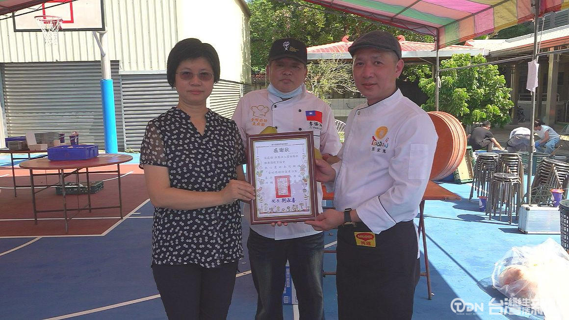▲院長代表頒發感謝狀給義煮團隊,I他們都是愛的總舖師。中秋節前,由幸福源義廚團團長李悌源發起,高雄金帽廚師義廚團、高雄逸軒義廚團、雲林縣救難義廚教育協會以及嘉義市廚師工會響應,號召大約40位廚師跟志工,一起來到雲林教養院 / 記者 王可萱 攝