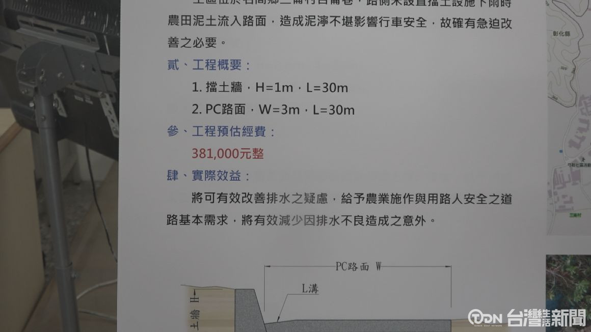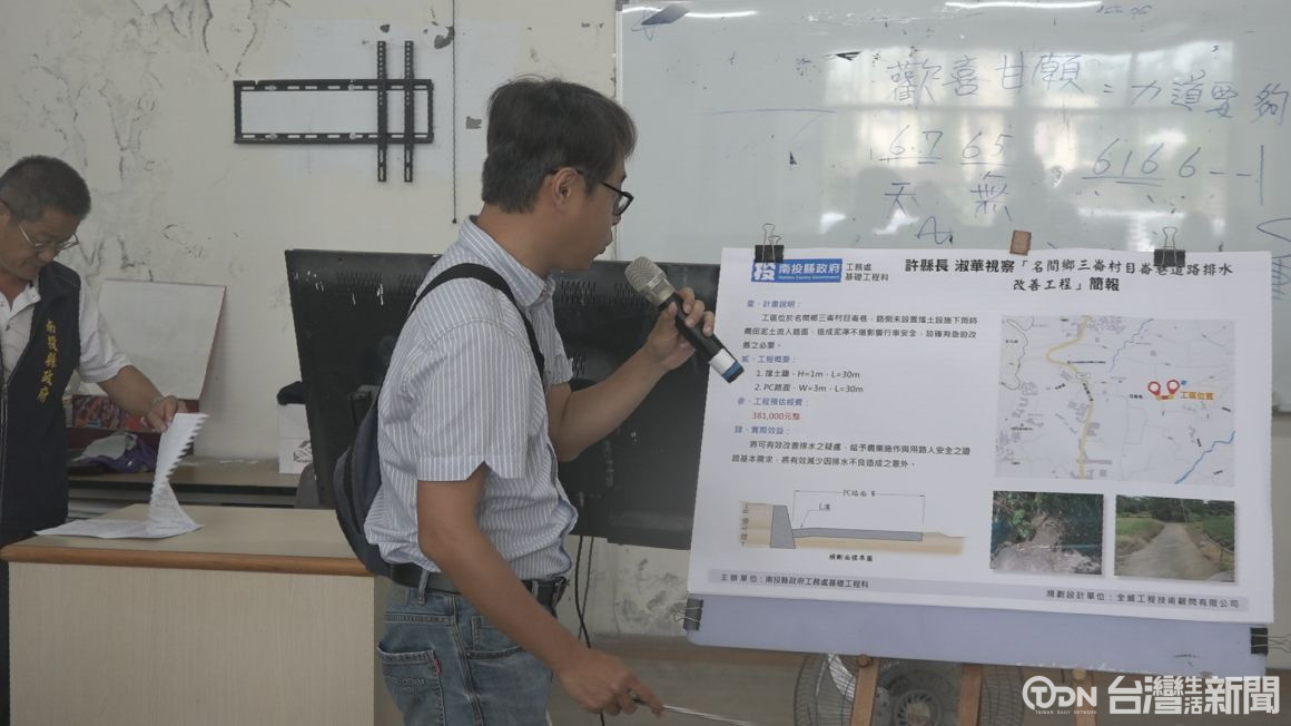 這次改善的工程包括三崙村36-1線、大庄村24線,以及名間鄉150線,三個地方的排水溝,還有三崙村目崙巷的道路排水,預計將會投入20萬到38萬的經費來改善。