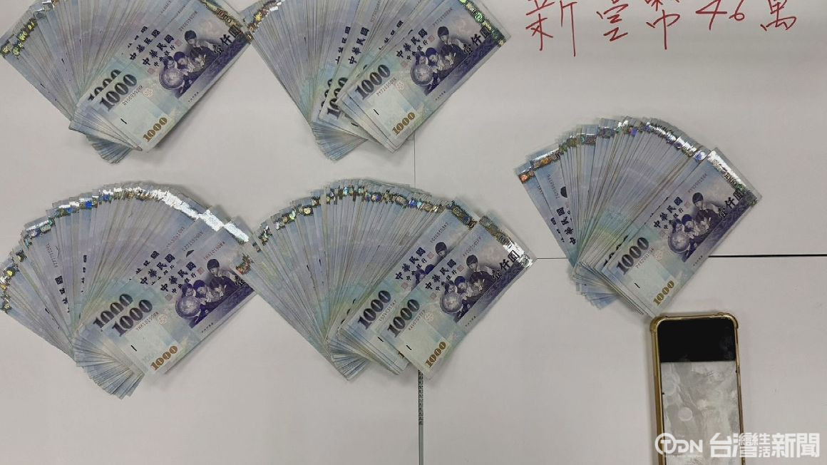 ▲警方查扣現金46萬元及犯嫌使用的工作手機,作為詐欺取款證物/南投縣警局 提供