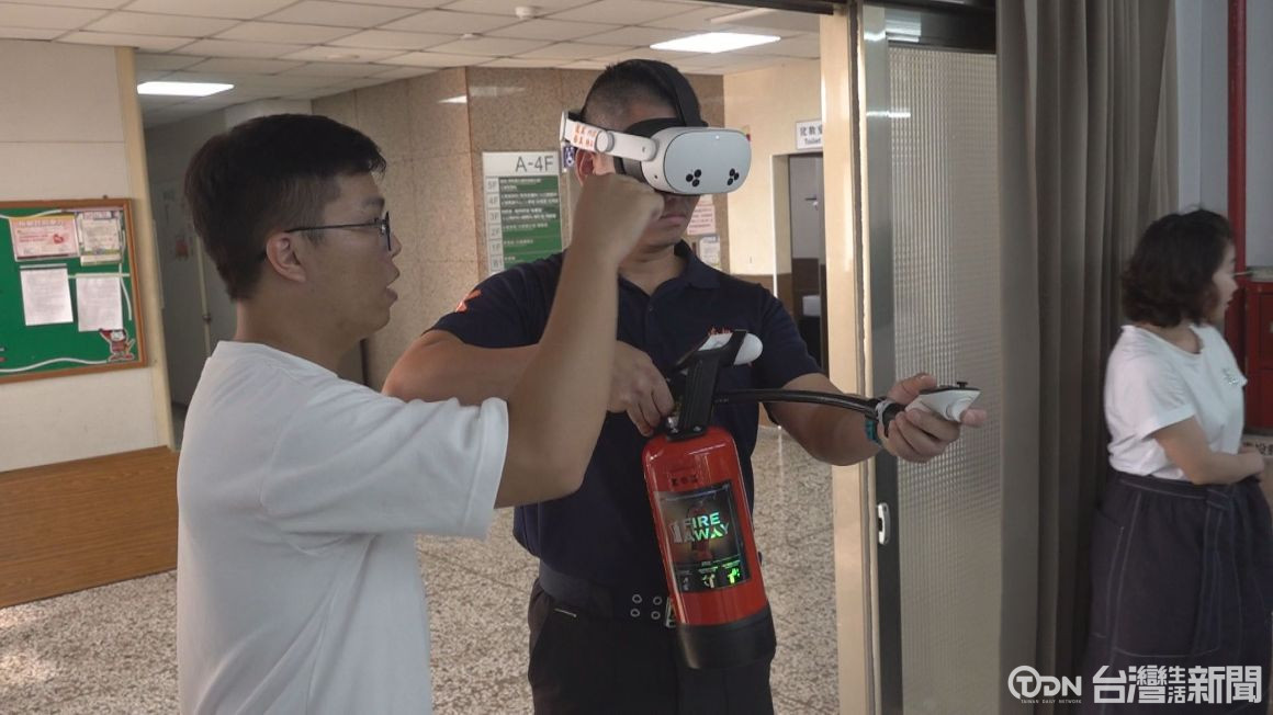 ▲消防員戴上XR眼鏡,手持虛擬滅火器,在模擬環境中練習滅火操作/記者 蔡育楷 攝