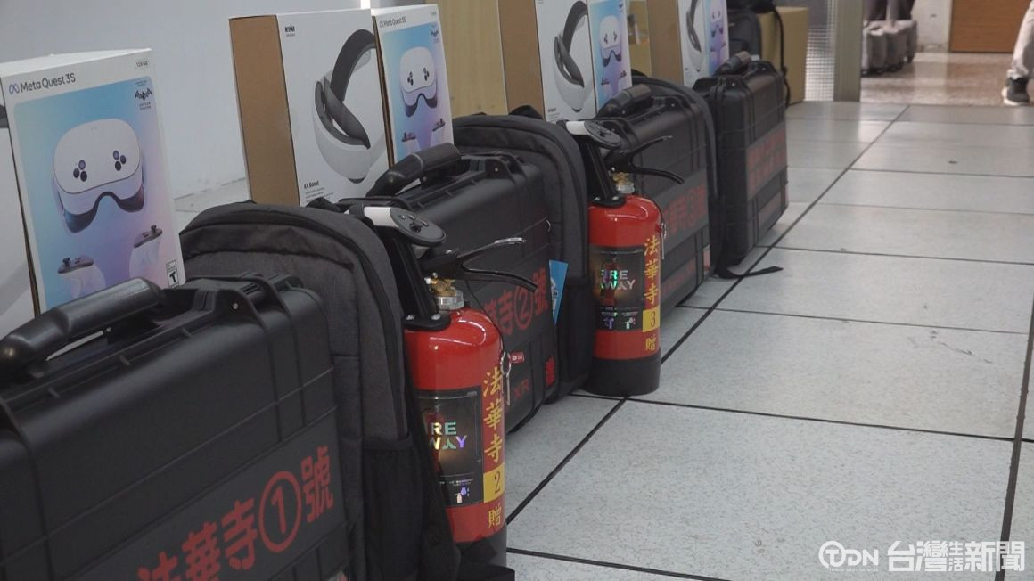 ▲四套XR虛擬滅火訓練設備整齊擺放,包含頭戴式顯示器與滅火器模擬裝置,總價值超過百萬元/記者 蔡育楷 攝
