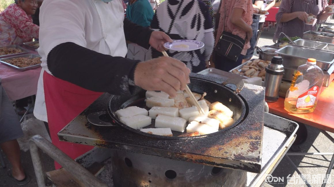 ▲斗南辦桌師傅鄭森唔現場煎再來米製的菜頭粿給民眾享用 / 記者
