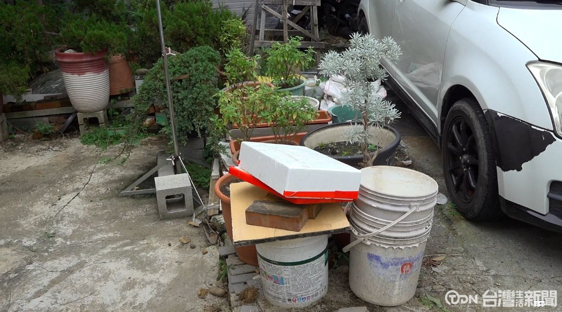 ▲有民眾缺乏公德心,搬來盆栽、鳥籠等雜物堆置在公佈欄前後/記者 賴秋峰攝