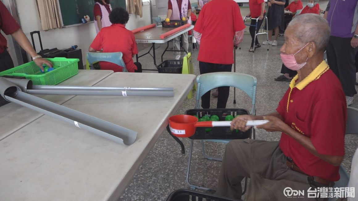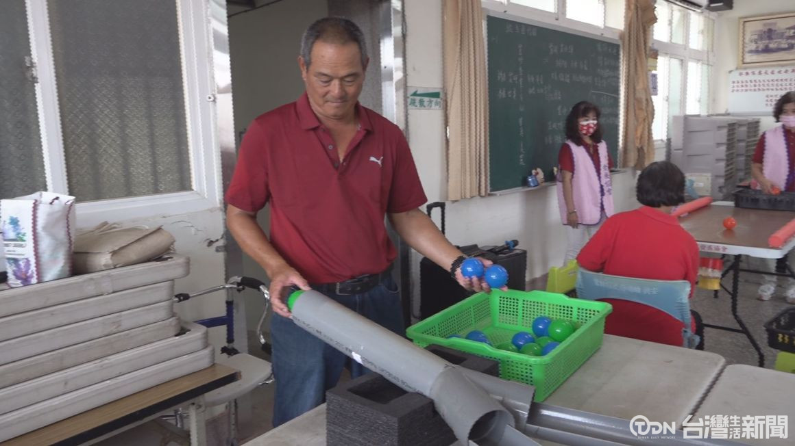 用水瓢接從水管滾出來不同顏色的球,再將球分色放進不同的籃子中,這是兼任大埤鄉興安村長以及興安社區發展協會理事長的劉國民自發研究,作出來的延緩失能、失智道具。他說這些是他上網看了之後,覺得是對長輩很好的運動,所以投入製作,目前已經做差不多有10樣,這天他是全數搬出來找社區阿公阿嬤試玩。