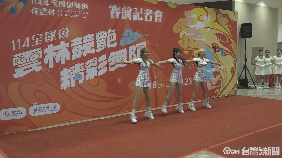 ▲職棒啦啦隊「樂天女孩」用應援舞,為114年全國運動會賽前記者會熱情開場。記者 謝沂辰/攝