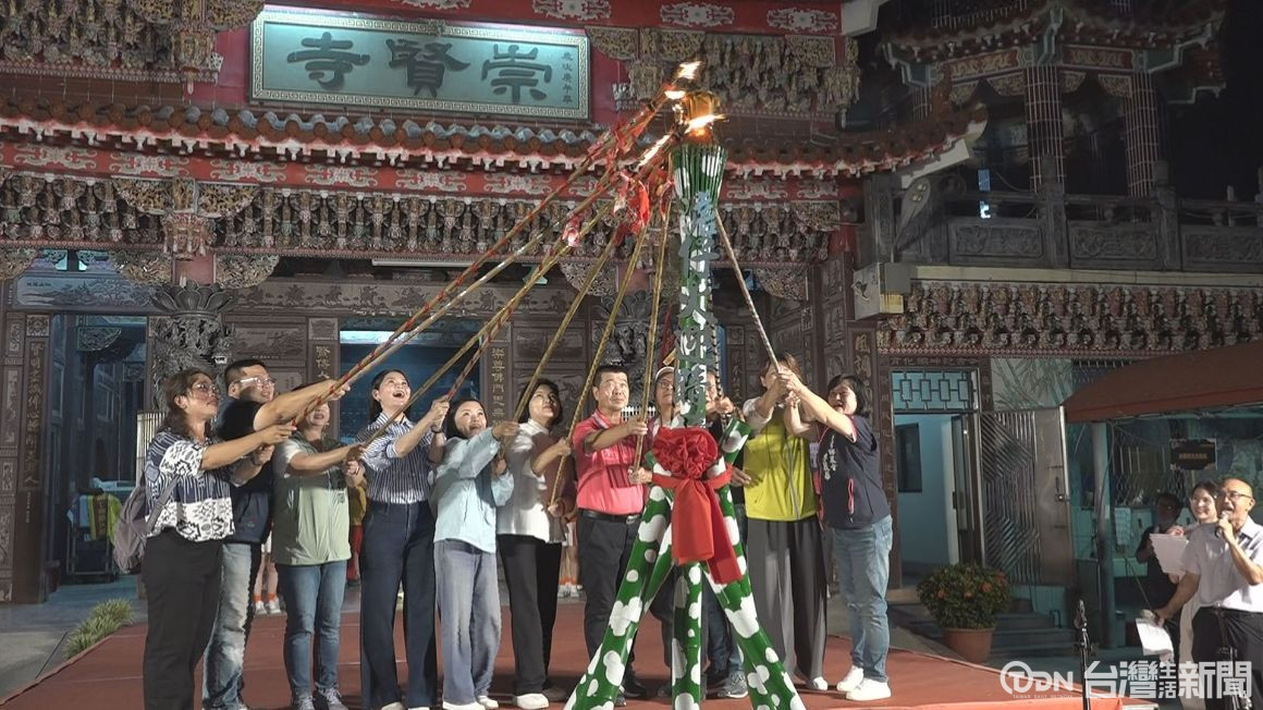 ▲眾人一起點燃崇賢寺「澹仔火迎暗境」活動主燈,正式展開舉火把遊客庄的習俗。記者 謝沂辰/攝
