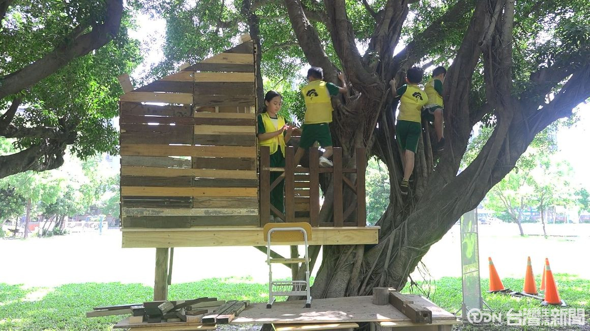 ▲樂業國小邀請樹屋協會到校指導學生,利用回收木片,在百年榕樹旁搭建樹屋/記者 張瑋玲攝
