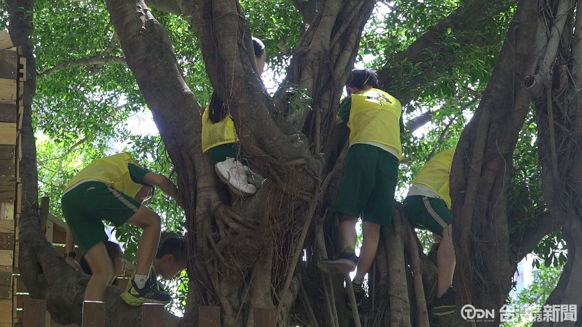 孩子們在樹上開心攀爬,累了就在一旁小木屋休息,透過攀樹體驗和樹屋製作課程,學生親自探索校園自然環境,也了解珍貴老樹的價值,把校園打造成情感與文化交織的場域。